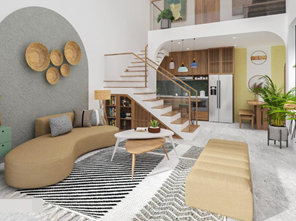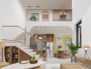 - Phòng khách là không gian sinh hoạt chung nên thường có không gian rộng rãi, được thiết kế kính lấy sáng có nhiều ánh sáng tự nhiên. Dưới đây là một vài hình ảnh phòng khách và cầu thang lên gác lửng: