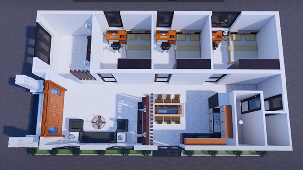 - Với 3,5 mét ngang còn lại có thể bố trí lần lượt là phòng thờ, phòng ngủ 1, phòng ngủ 2 và phòng ngủ 3 như hình bên dưới.