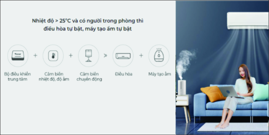 - Sáng tạo ngữ cảnh trong nhà: Các thiết bị sẽ tự động bật lên khi cảm biến nhận diện được khi mình về nhà và tự động tắt thiết bị khi mình ra khỏi nhà.